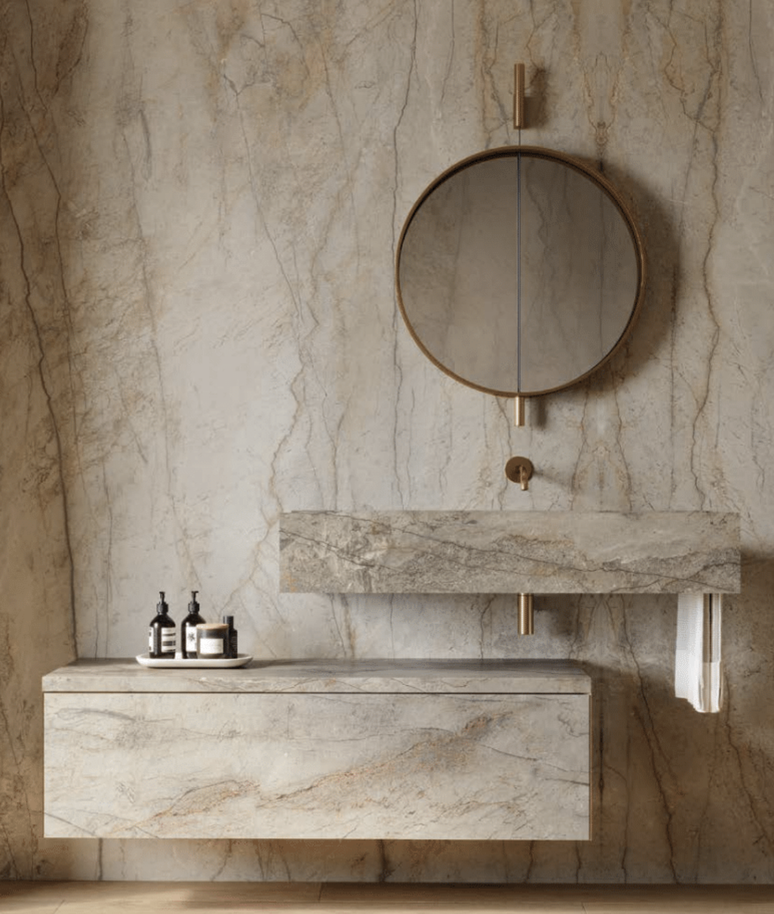 Soft ivory stone, light timber joinery and warm metallic accents create a bright, elegant atmosphere. The Light Collection emphasises natural tones and gentle textures, bringing a sense of openness and quiet refinement to the home.